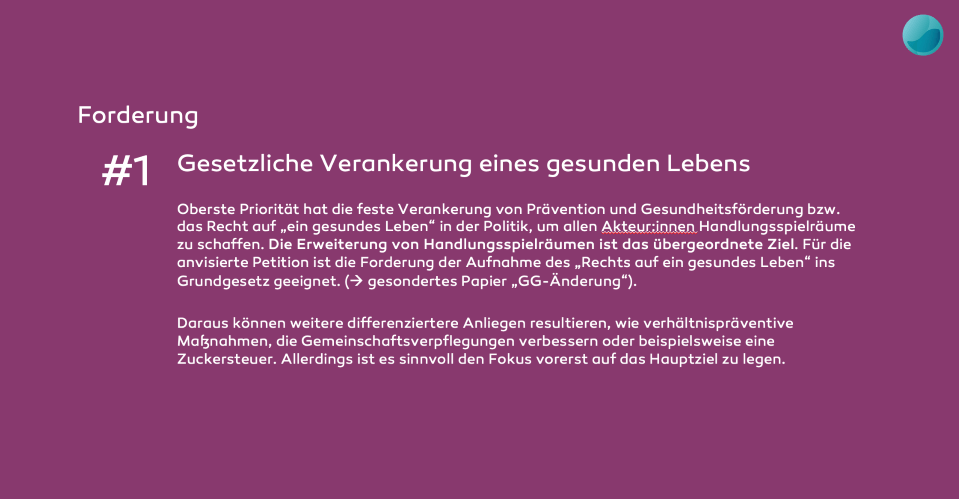 Die Antwort fanden wir im Grundgesetz. Schutz und Förderung von Gesundheit müssen als Grundrecht und damit als Aufgabe allen politischen Handelns verankert werden. Der Weg zur Erreichung dieses großen Ziels führte uns auf die Petitionsplattform des Bundestages.
